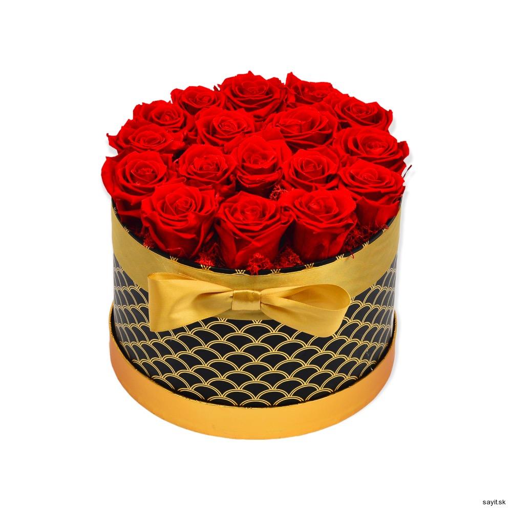 - Trvácne červené ruže v zlatočiernom boxe
