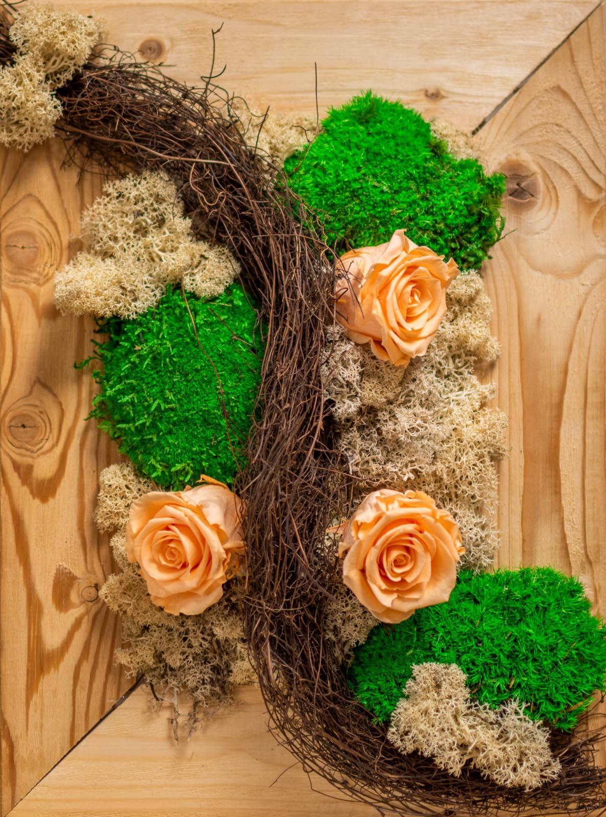 Machový obraz z tmavozeleného a krémového stabilizovaného machu a 3 marhuľovými stabilizovanými ružami je nádherným prírodným doplnkom pre váš domov.