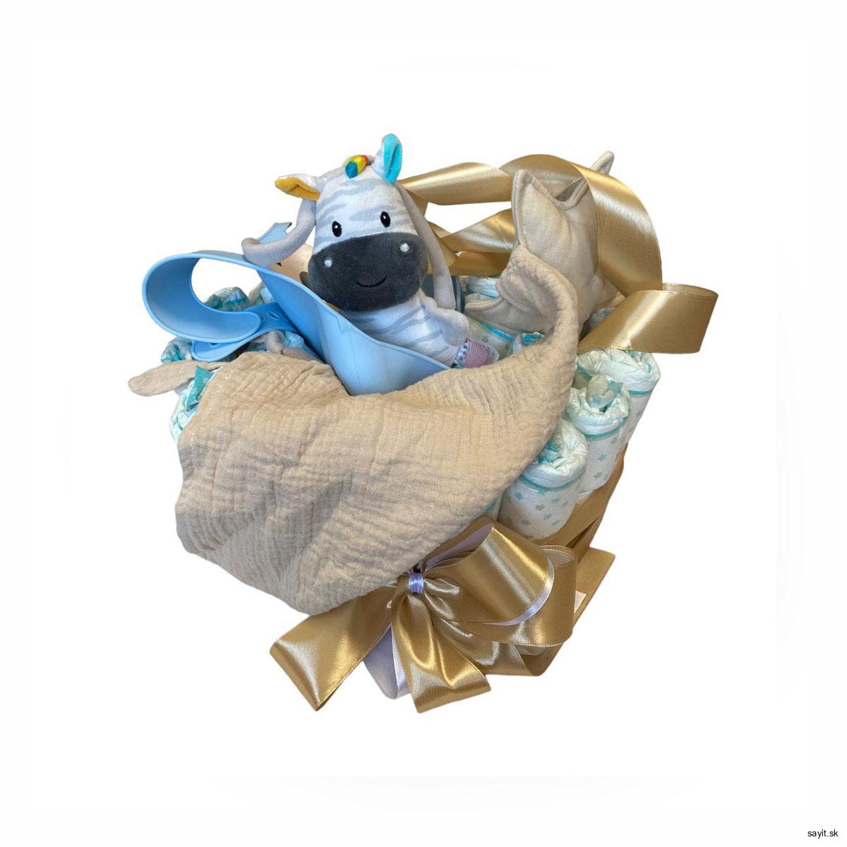 Plienková torta v zlato-modrej farbe je dokonalým darčekom. Táto originálna a praktická torta je vyrobená z kvalitných plienok, ktoré budú nápomocné pre novonarodeného bábätko.